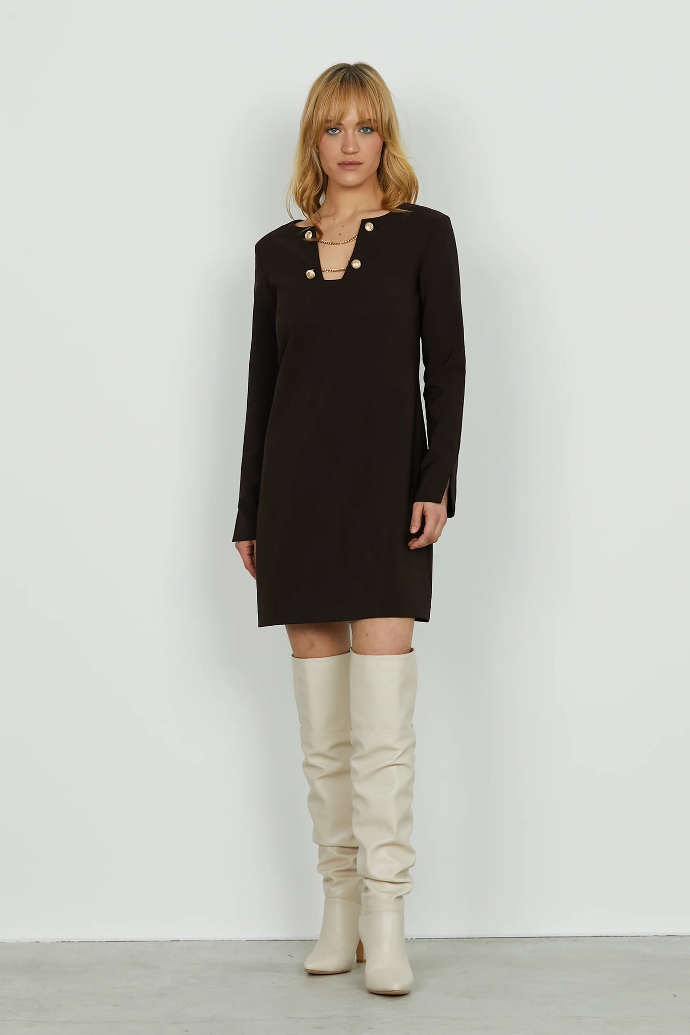 L’Abito Tempor corto unisce il fascino del design contemporaneo con dettagli glamour che catturano lo sguardo. Realizzato in un tessuto fluido che valorizza la figura, è caratterizzato da maniche lunghe, uno scollo a goccia con bottoncini decorativi e un elegante inserto a specchietto. Le catene gioiello applicate aggiungono un tocco audace e ricercato.